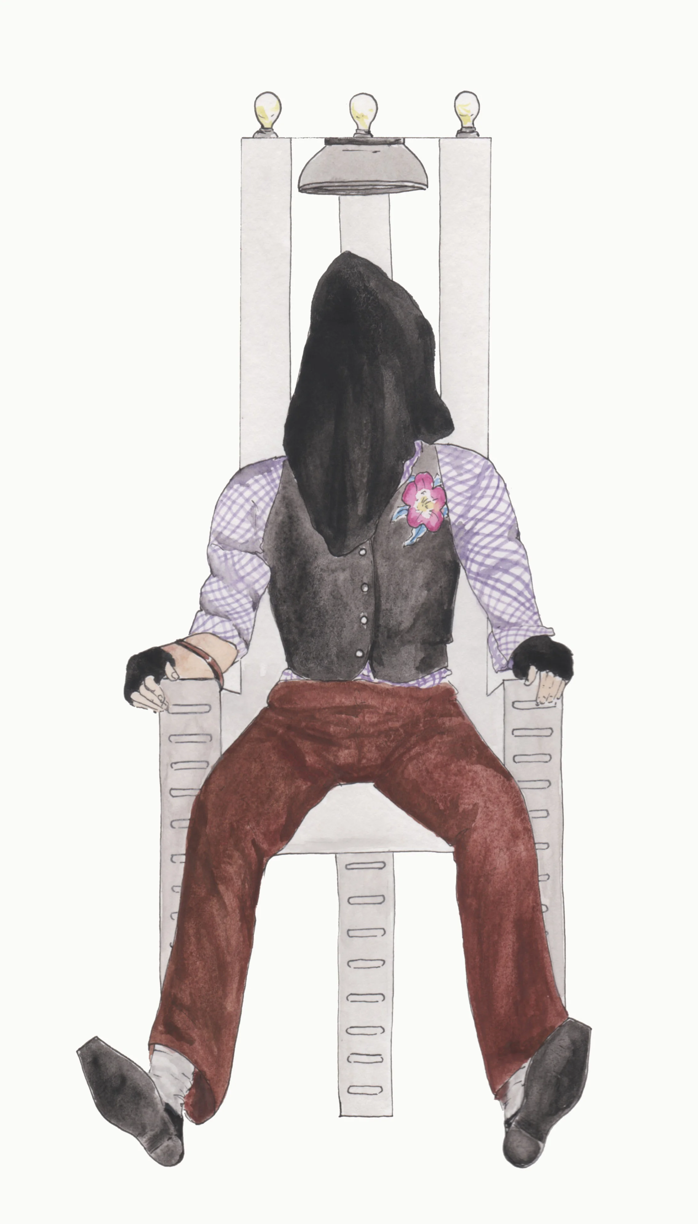 Here is a featured illustration of writer Jason Hannan a.k.a. Drama bin Laden from an illustration/interview series by Crystal Vielula on dynamic people in San Francisco and their alter egos/performance personae. Below are the featured counterpart drawings of Jason/Drama from the gallery. TOP: As a subdued Bruce Wayne/Batguy strapped in the electric chair meant for the Jokester. BOTTOM: Jason on a typical day.